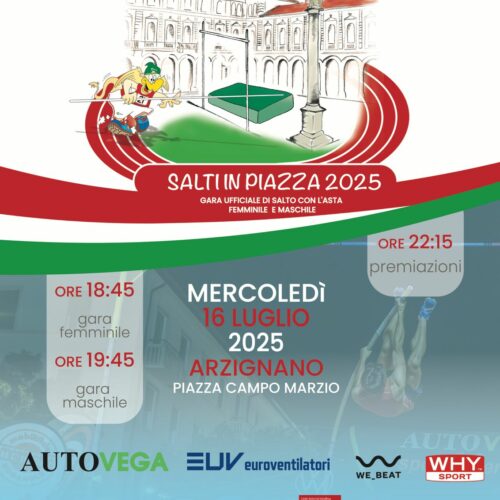 A poche settimane dai campionati italiani assoluti e a un mese e mezzo dai mondiali giapponesi dove l’atletica italiana si metterà di nuovo in mostra, mercoledì 16 luglio 2025 a partire dalle 18:45 in Piazza Marconi ad Arzignano torna la magia del salto con l’asta nei centri storici grazie alla spettacolare manifestazione SaltInpiazza trofeo AUTOVEGA. La città del grifo si conferma come una dei pochi appuntamenti di questo tipo che si svolgono in Veneto e nel Nord-Italia, mediante una competizione ufficiale Fidal grazie alla pedana regolarmente omologata e all’inserimento nel “global calendar” della World Athletics. Chiusura prevista con le premiazioni alle ore 22:45.