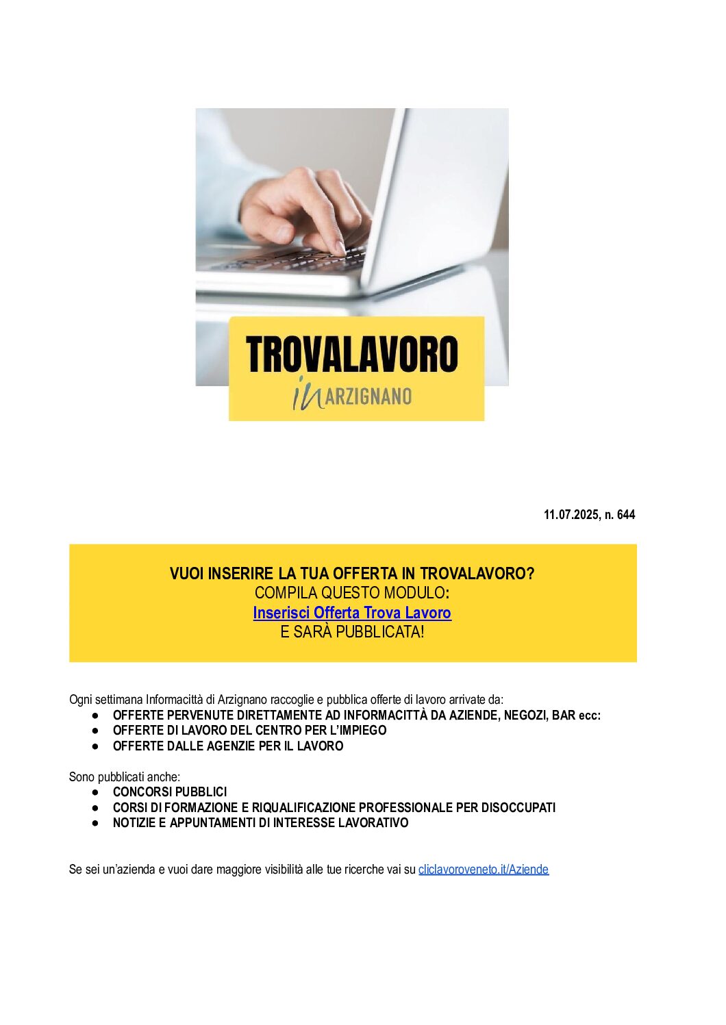 Ogni settimana con il TROVALAVORO pubblichiamo offerte di lavoro in Arzignano e dintorni raccolte da Informacittà di Arzignano.