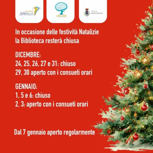 Dicembre: 24, 25, 26, 27 e 31 (29, 30 aperto con i consueti orari)