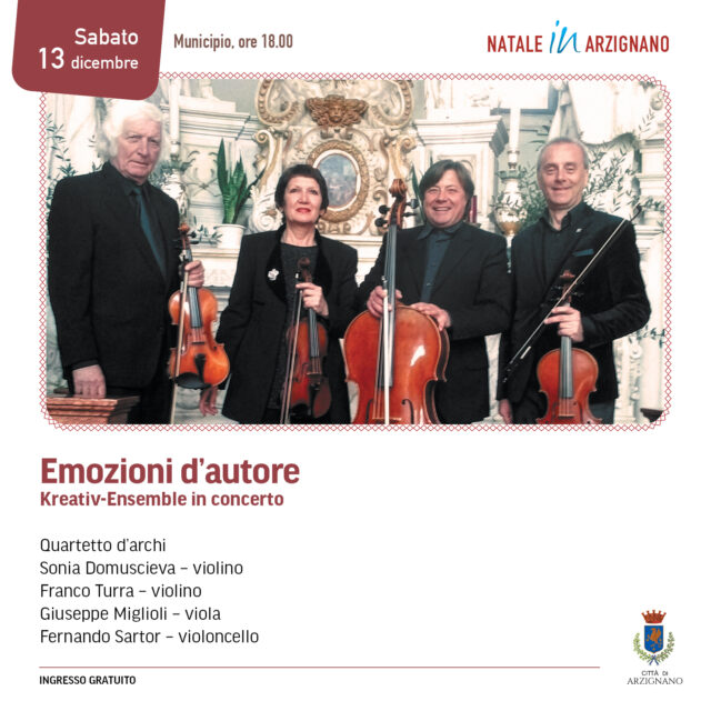 Evento Biblioteca e Cultura Intrattenimento e Feste Evento, sabato 13 Dicembre 2025 Emozioni d’autore. Kreativ-ensemble in concerto. Sabato 13 dicembre in Municipio