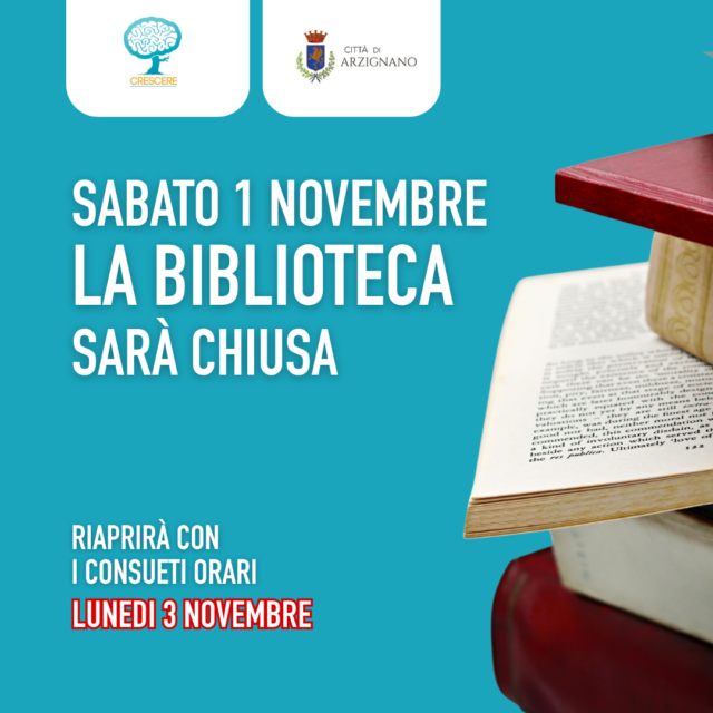 Comunicato Biblioteca e Cultura Senza categoria Comunicato, 29 Ottobre 2025 Chiusura biblioteca sabato 1 novembre