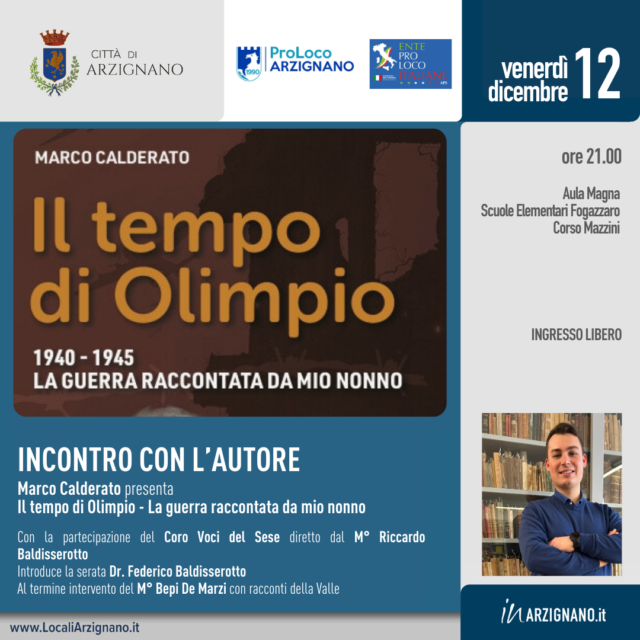 Evento Biblioteca e Cultura Evento, venerdì 12 Dicembre 2025 Il tempo di Olimpio. La guerra raccontata di mio nonno. Incontro con l’autore Marco Calderato, venerdì 12 dicembre